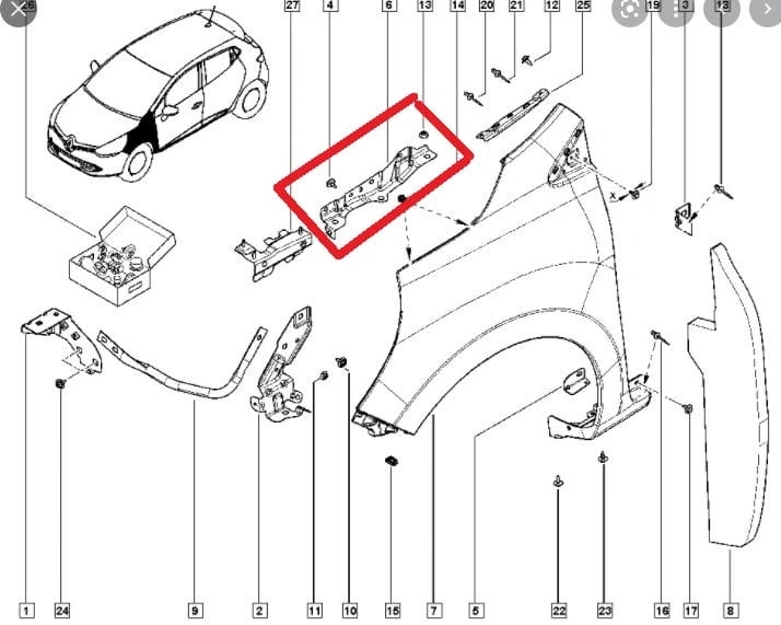 RENAULT CLIO- 4- HB- 13/16; ÖN ÇAMURLUK BAĞLANTI SUPORTU SOL (ORTA KISIM) (SAC) (EAGLE BODY)